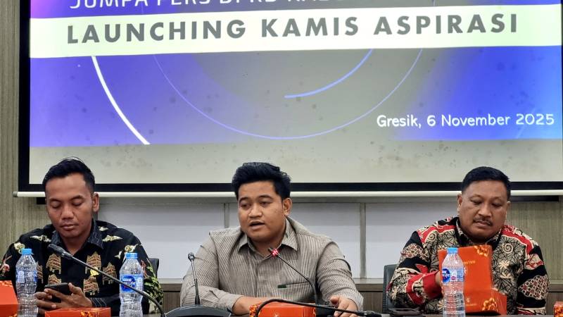 Ketua DPRD Gresik M Syahrul Munir (tengah) bersama Wakil Ketua Mujid Riduan (kanan) dan Ketua Komisi IV Muchamad Zaifudin ketika menjelaskan kanal pengaduan e-asmara, Kamis 6 November 2025.