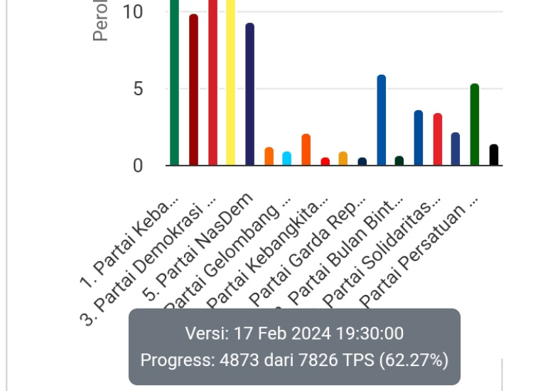 Berdasarkan real count KPU yang dirilis melalui laman sistim informasi rekapitulasi (Sirekap) 17 Februari 2024 pukul 19.30 di website resmi KPU RI. https://pemilu2024.kpu.go.id, yang sudah selesai perhitungan sebesar 62.27 persen.
