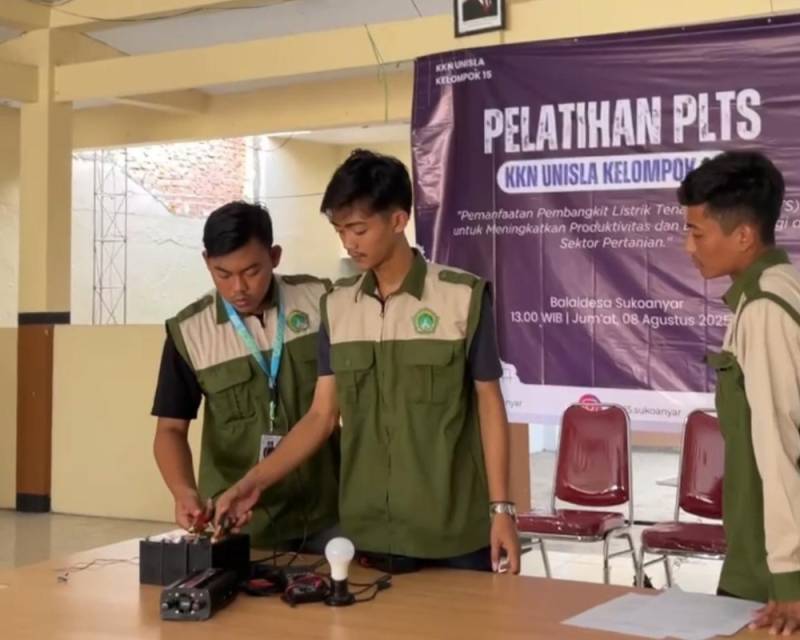 SUARABHINNEKA, LAMONGAN – Mahasiswa Kuliah Kerja Nyata Universitas Islam Lamongan (KKN) Unisla menggelar pelatihan pemanfaatan Pembangkit Listrik Tenaga Surya (PLTS) di Desa Sukoanyar, Kecamatan Turi, Jumat (8/8/2025).