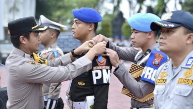 Kapolres Gresik AKBP Rovan Richard Mahenu ketika menyematkan pita tanda dimulainya Operasi Zebra Semeru 2025 di wilayah Kabupaten Gresik, Senin…
